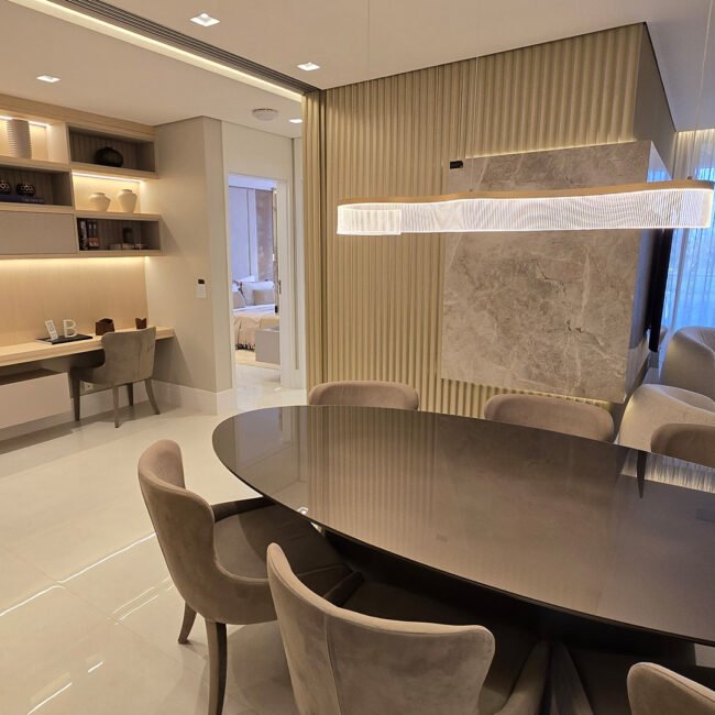 Mesa oval, pendente em anel e painéis ripados integrados.