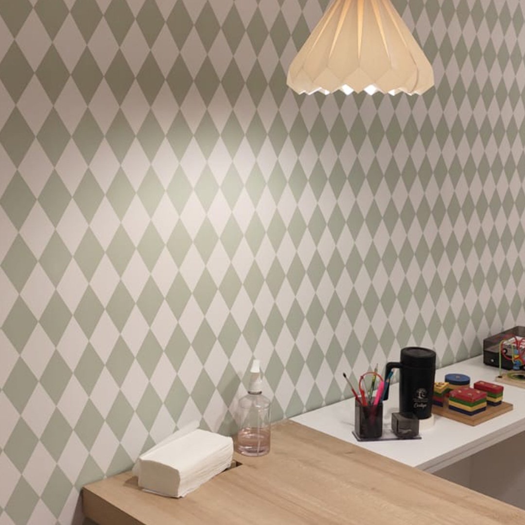 Harlequin verde-claro, pendente delicado e bancada para estudos.