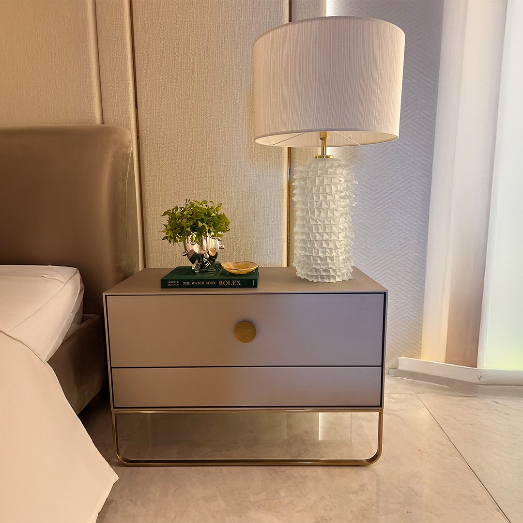 Cabeceira ripada, luminária cerâmica texturizada e paleta bege.