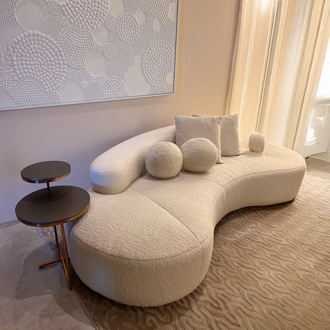 Sofá orgânico em off-white, texturas macias e aconchego contínuo.