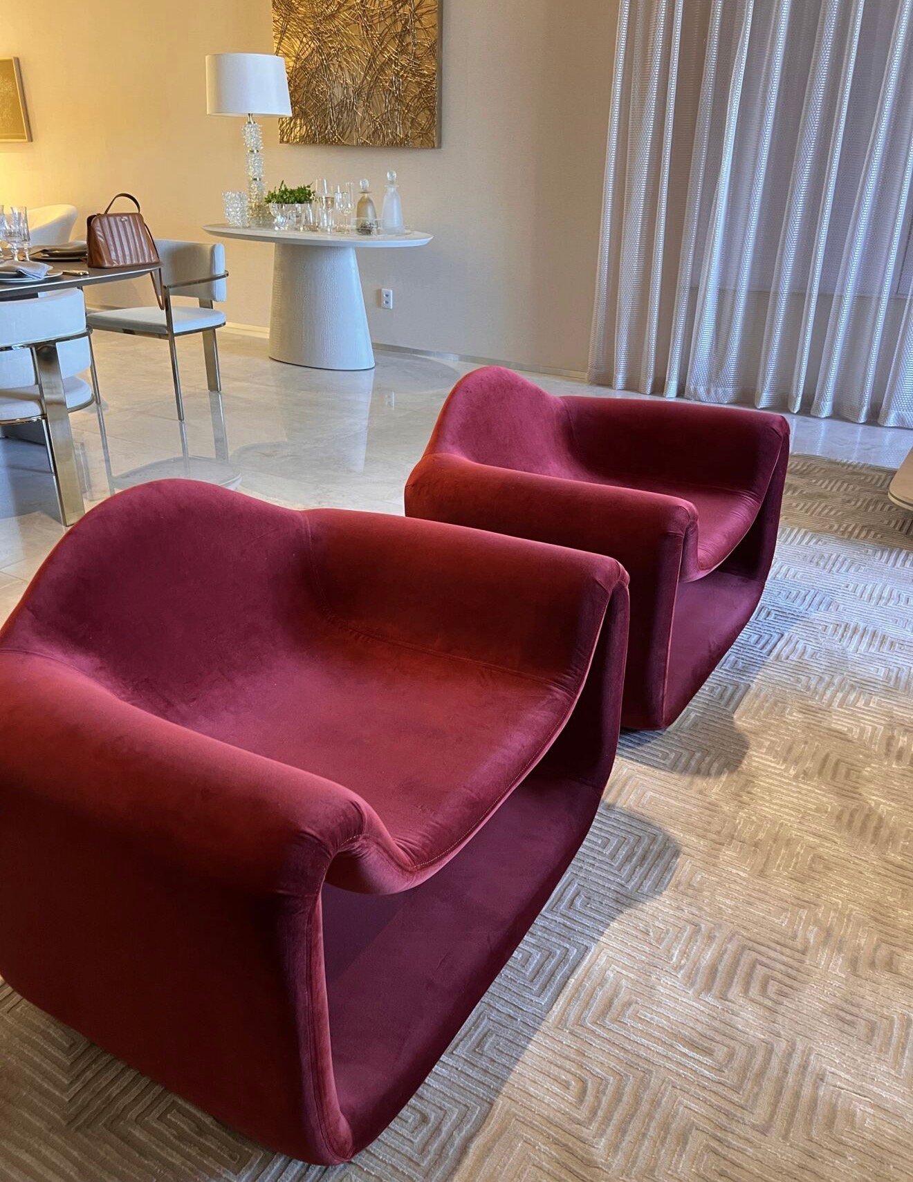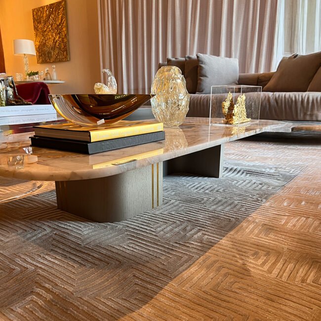 Mesa em pedra, metais dourados e tapete geométrico de volume.