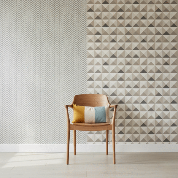 Geométricos são excelentes aliados em projetos moduláveis: funcionam tanto em paredes inteiras quanto em painéis parciais, facilitando futuras mudanças de layout e integração com elementos de armazenamento e iluminação.